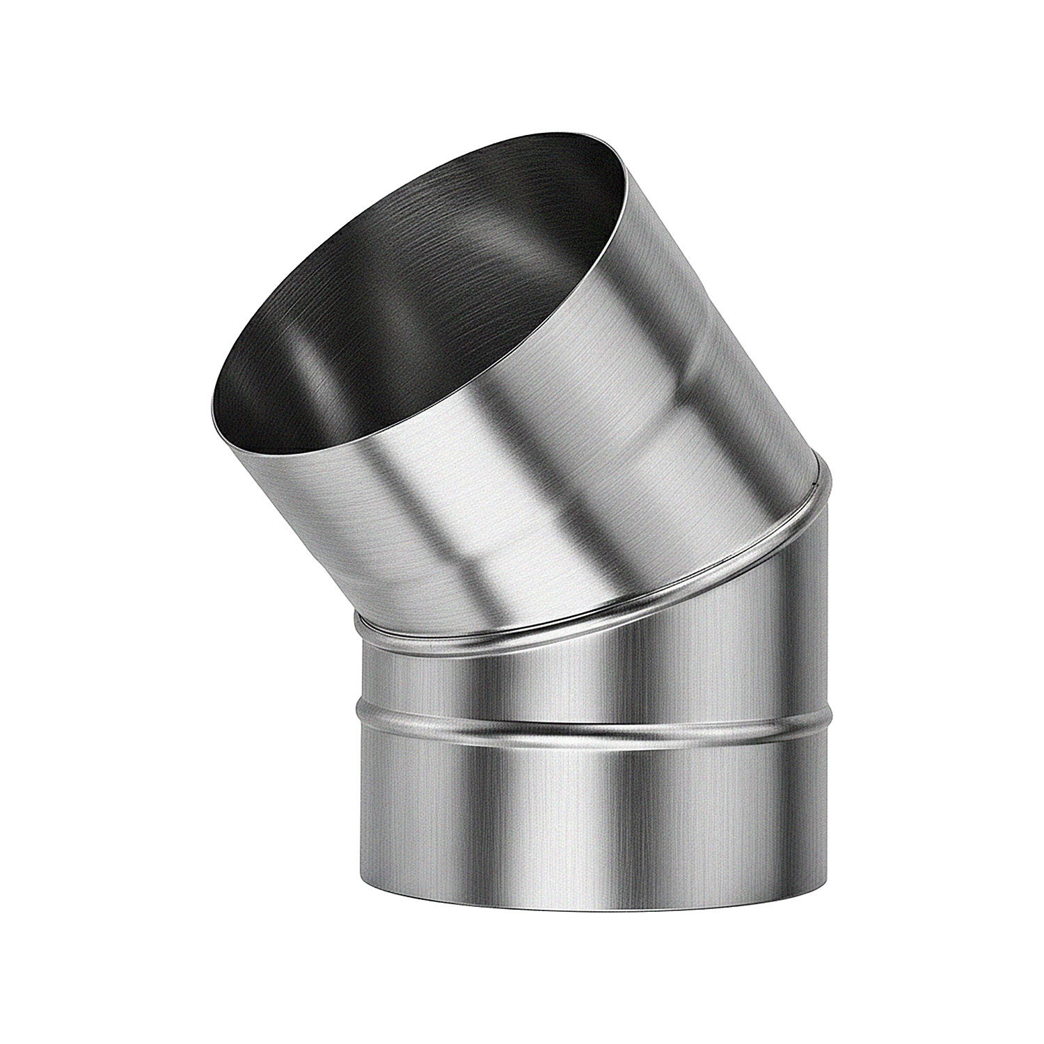 Curva soldada 45°, em inox escovado, para chaminés com saídas de 135 mm.